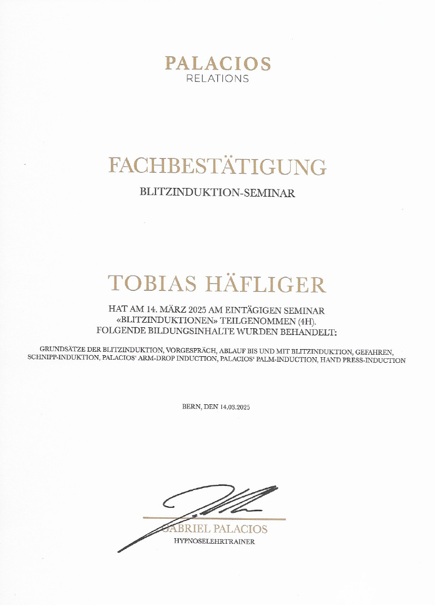 Zuerst mal an TOBIAS HÄFLIGER ein rieses Dankeschön bin überglücklich. Ich ging zu Tobias weil ich Prüfungsangst hatte und das schon seit Kindheit heute weiss ich das man das bewältigen kann. Ich ging zu Tobias in die Hypnose und es tat so gut, er versteht sein Handwerk top und kann Dir wirklich helfen. Ich empfehle jedem der PRÜFUNGSANGST hat zu IHM zu gehen. Er ist sehr kompetent, freundlich und einfühlsam. DANKE TAUSEND MAL LIEBER TOBIAS. Werde Dich sehr gern weiterempfehlen. LG Tamara.R