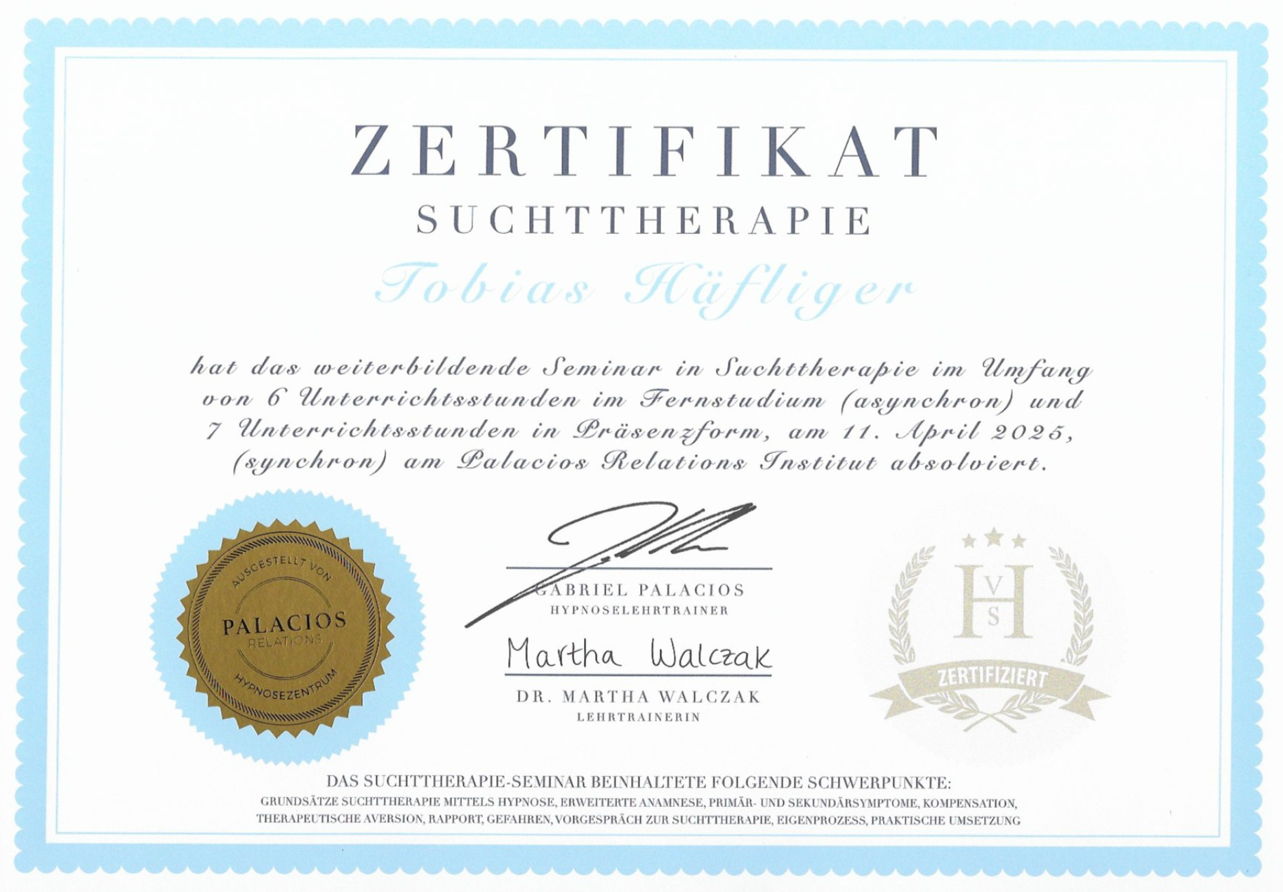 - Zertifikat Suchttherapie VSH